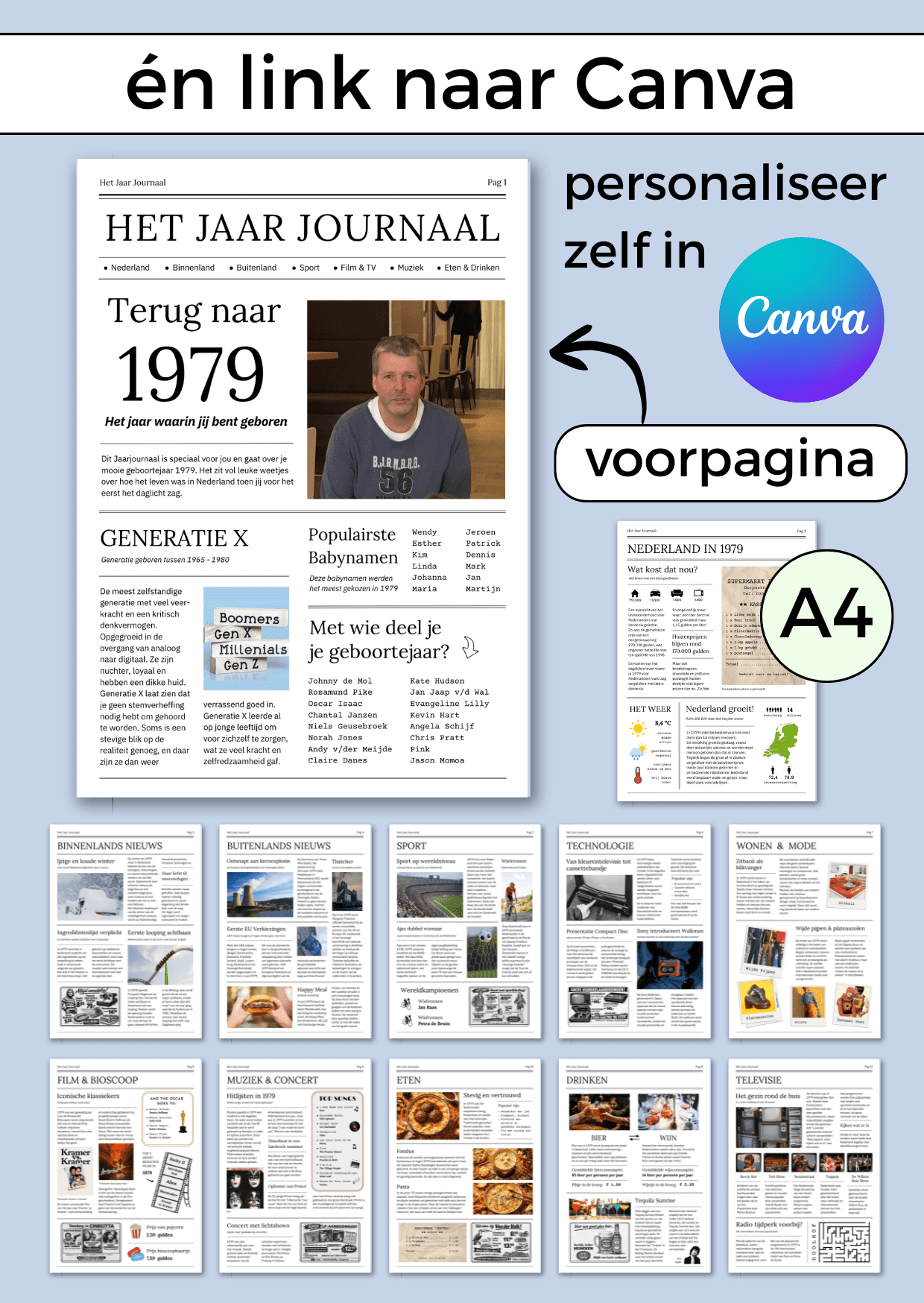 Bestaande uit 12 pagina’s in A4 formaat. Je kunt hier niets in aanpassen, deze is dus om direct uit te printen op je eigen printer (of stuur PDF naar een copyshop en laat A3 printen, als een krant). Hier staat een foto van 1979 op de voorpagina, geen foto van de jarige. Voor als je het snel nodig hebt of alles makkelijk wilt houden.