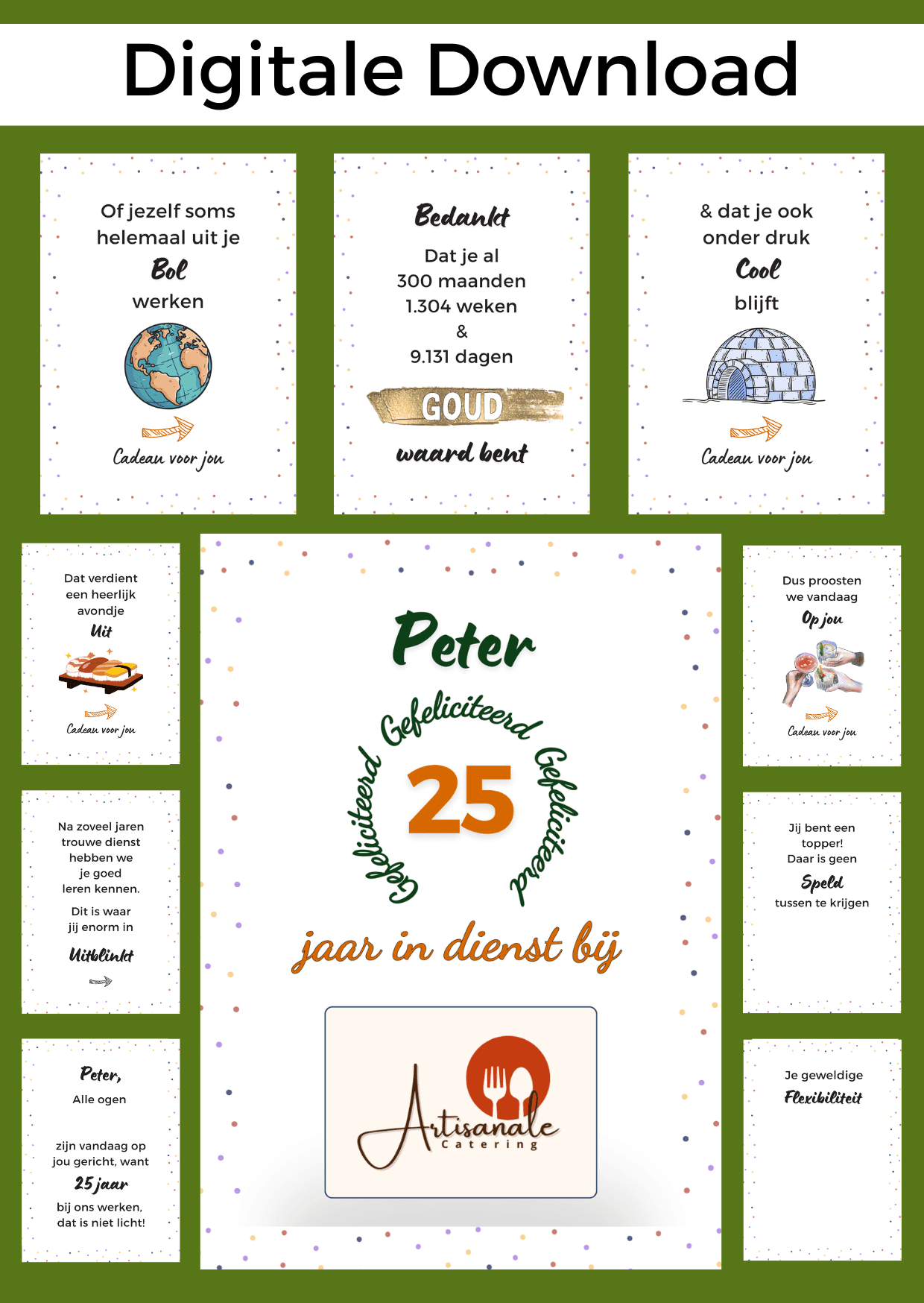 Is een werkneemster of collega 25 jaar in dienst en willen jullie eens iets origineels geven? Met deze A6 downloads geef je een onvergetelijk cadeau aan haar!