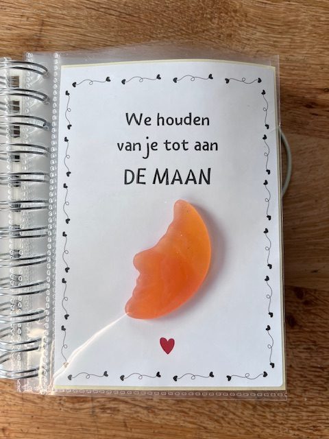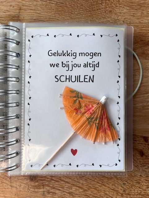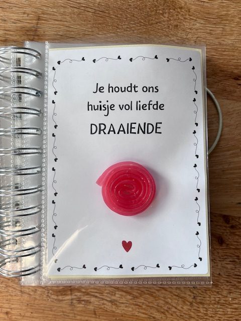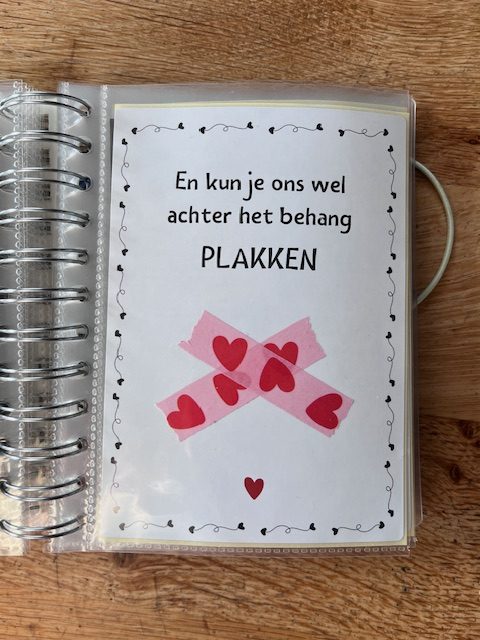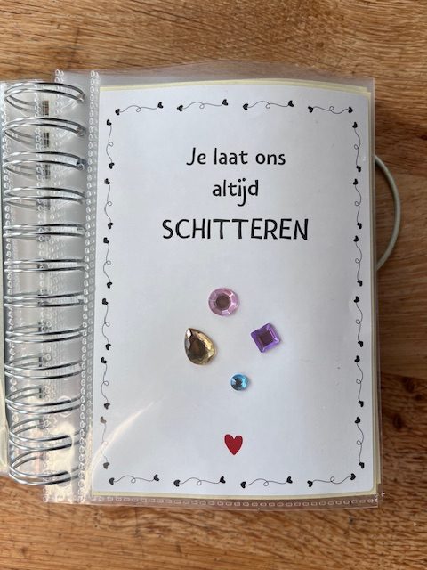 Je print de vellen uit en doet ze in een insteek fotoalbum boekje samen met de cadeaubonnen en mini cadeautjes.